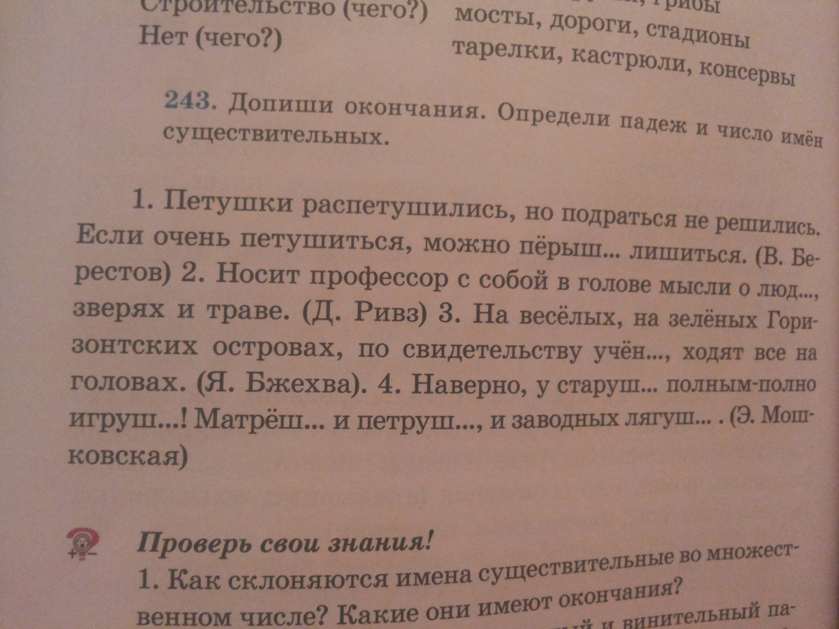 1.Петушки (им.падеж, множественное число) распетушились, но подраться не решились. Если очень петушиться, можно перышЕК лишиться. 2.Носит профессор(им.падеж, ед.число) с собой в голове (предложный падеж, ед.число) мысли о людЯХ, зверях и траве(предложный падеж, мн.число).3. На веселых, на зеленых Горизонтских островах, по свидетельству ученЫХ, ходят все на головах.4. Наверно, у старушЕК полным-полно игрушЕК! МатрешЕК и петрушЕК, и заводных лягушЕК