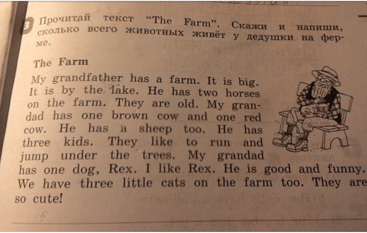 прочитай текст The Farm.напиши сколько всего животных живёт на ферме у дедушки. My grandfather has a farm.It is big.It is by the lake.He has two horses on the farm.They are old.My grandad has one brown cow and one red cow.He has a sheep too.He has three kids.They like to run and jump ubder the trees.My grandad has one dog,Rex.I like Rex .He is good and funny.We have three little cats on the farm too.They are so cute!