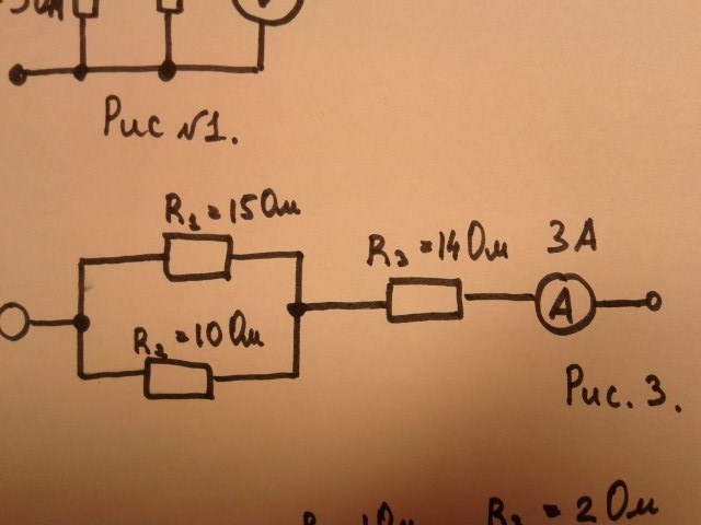 РИС 3- определите сопротивление сопротивление цепи и напряжение на всем участке(R1=15 Ом,R2=10 Ом, R3=14 Ом, 3 А)