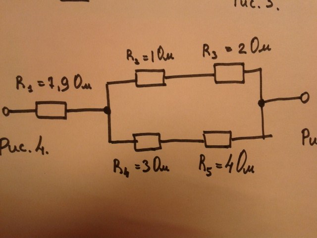 РИС 4- определите по данной схеме общее сопротивление цепи (R1=7,9 Ом,R2=1 Ом, R3=2 Ом, R4=3 Ом, R5=4 Ом)
