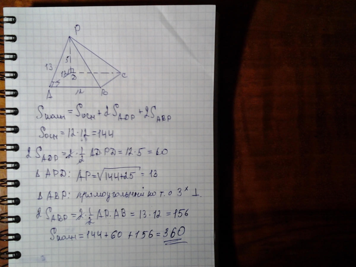 Основание пирамиды - квадрат со стороной 12 см. Две боковые её граны перпендикулярны плоскости основания. Вычислите площадь полной поверхности пирамиды,