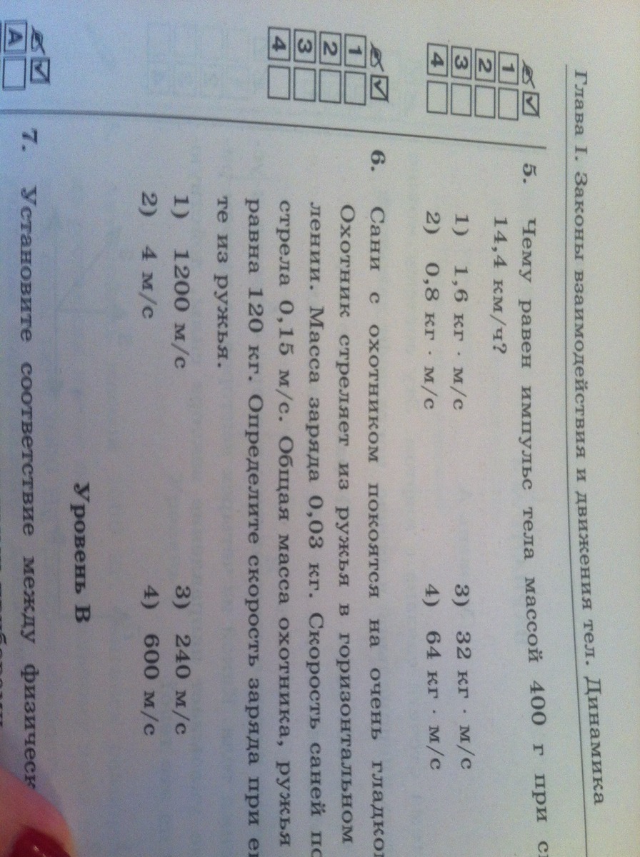 5. Импульс тела равен p=mv; Переводим скорость в м/с, для этого скорость в км/ч надо разделить на 3,6. 14,4/3,6=4 м/с;