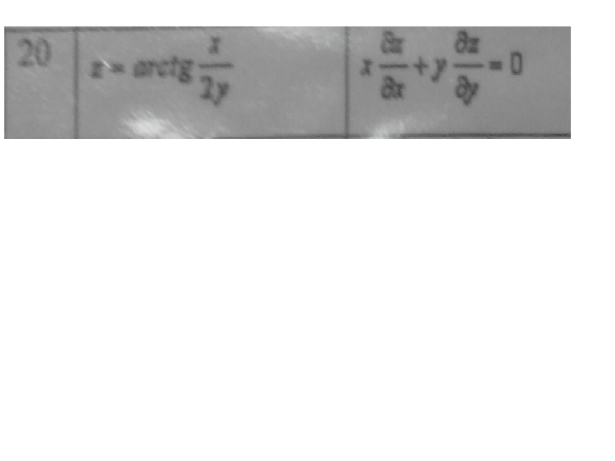 z=arctgfrac{x}{2y}\\frac{partial z}{partial x}=frac{1}{1+frac{x^2}{4y^2}}cdot frac{1}{2y}=frac{2y}{4y^2+x^2}\\frac{partial z}{partial y}=frac{1}{1+frac{x^2}{4y^2}}cdot frac{-2x}{4y^2}=-frac{2x}{4y^2+x^2}\\xcdot frac{partial z}{partial x}+ycdot frac{partial z}{partial y}=frac{2xy}{4y^2+x^2}-frac{2xy}{4y^2+x^2}=0