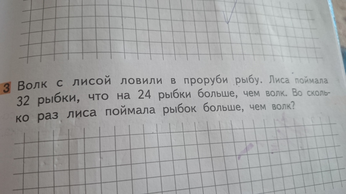 волк с литой ловили в проруби рыбу. лиса поймала 32 рыбки,что на24 рыбки больше, чем волк