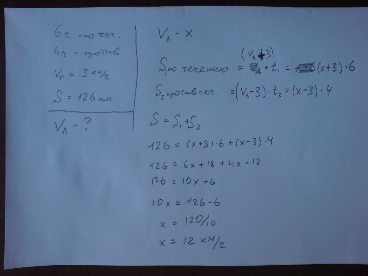 Лодка плыла 6 ч по течению рекии,а затем 4 ч против течения.Найдите собственную скорость лодки, если известно, что скорость течения реки вавна 3км/ч, а всего лодкой пройдено расстояние 126км.(скиньте пожалуйста фото с решением этого уравнения мне так понятнее)