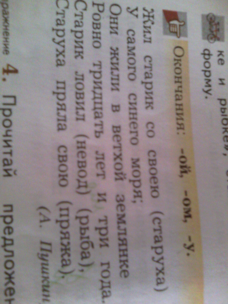3 задания. Спиши отрывок из сказки о рыбаке и рыбке, ставя дополнения в нужную форму.