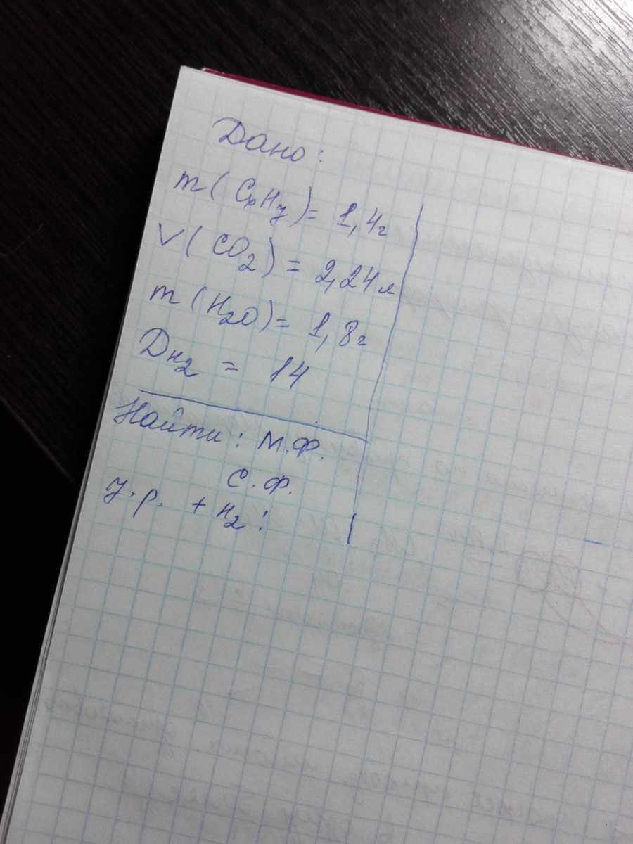 M(CxHy)=14D[H2](CxHy) ; M(CxHy)=14×2г/моль=28 г/моль ; v[количество](СхНу)=1,4г÷28г/моль=0,05 моль; v(C)=v(CO2) ; v(C)=[2,24л углекислоты÷28г/моль]÷0,05 моль =1,6 моль т.е. 2 моль углерода. v(H)=2v(H2O) ; v(H)=[1,8г÷18г/моль]×2 моль=0,2/0,05=4 моль водорода. v(C):v(H) как 2:4 ,этилен. Структурную напишите там писать нечего,гидрирование: C2H4[t,p,Ni,+H2]=C2H6,этан.