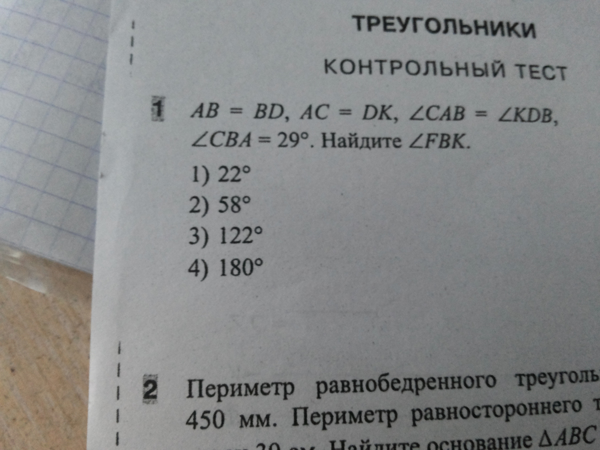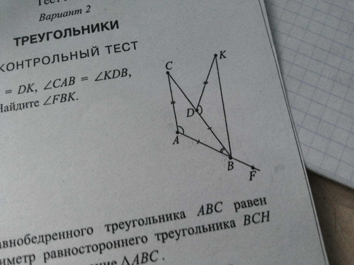 Так как СА = DK, АВ=DB и угол САВ=углуKDB, то треугольники САВ и KDB равны по первому признаку равенства треугольников ( по двум сторонам и углу между ними). Отсюда следует, что угол KBD= углу СВА =29 градусов. Так как они вместе являются смежными с углом FBK (их сумма равна 180 градусов). То есть, угол FBK= 180 - (29+29)= 122 градуса.