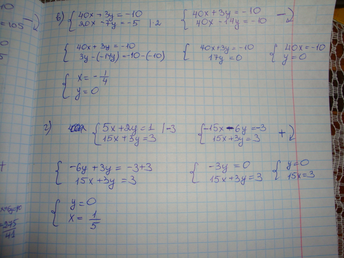 Очень прошу помогите!!!- решить систему уравнений методом алгебраического сложения!!!- а) 5х + 3у = 20 2х - 4у = 21 б) -5х+3у=20 2х+7у=47 в) 40х+3у=-10 20х-7у=-5 г) 5х+2у=1 15х+3у=3