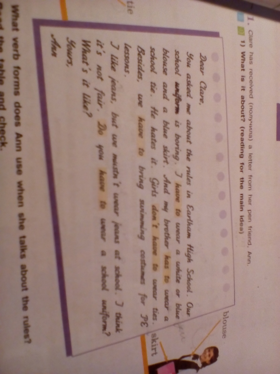 Ты спрашивала про правила в Эрсамской старшей школе.В нашей школе форма скучная.Я должна носить белую блузку и голубую(синию) юбку.А мой брат должен носить галстук.он не любит (ненавидит)это.Девочкам не надо носить галстуки.Также мы должны приносить плавательный костюм на урок физкультуры.