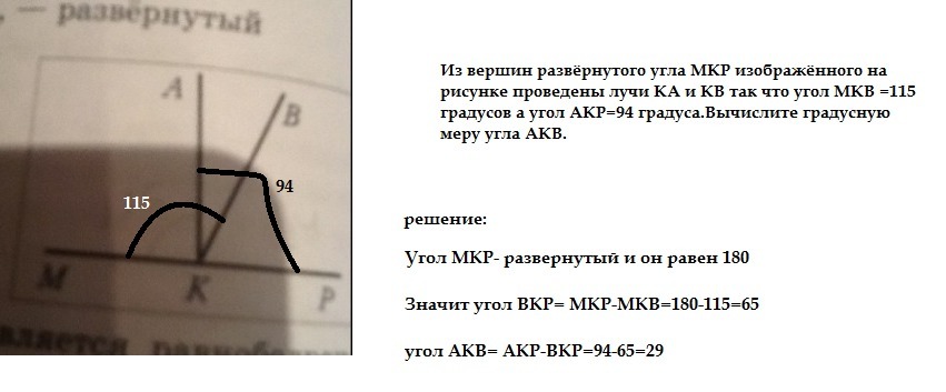 Из вершин развёрнутого угла МКР изображённого на рисунке проведены лучи КА и КВ так что угол МКВ =115 градусов а угол АКР=94 градуса.Вычислите градусную