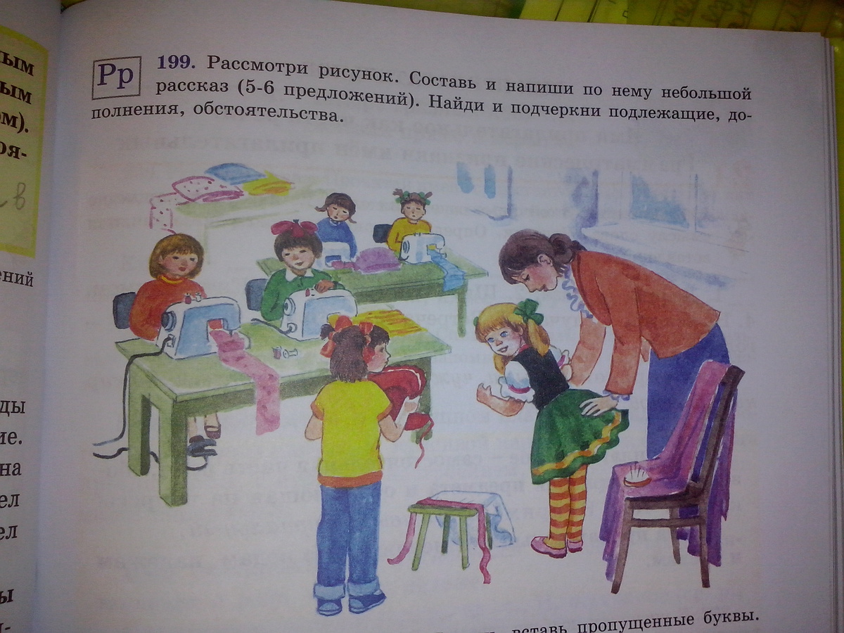Скорее всего, эти шесть девочек пришли на кружок шитья. Им по семь-восемь лет. Четыре девочки шьют с помощью швейное машинки. Одна из них хочет подойди к учителю и показать, какой чепчик она сделала. Другая девочка помяла свою зеленую юбку и учительница предложила ей выпрямить ее.