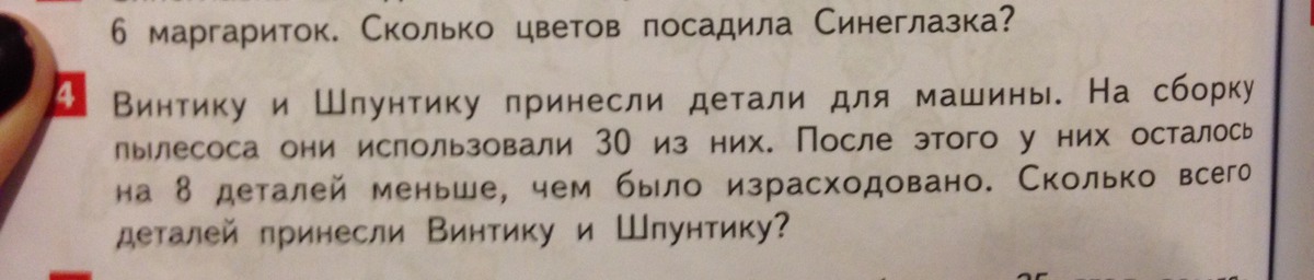 Деталей осталось на 8 меньше, чем было израсходовано,то есть 30-8=22 столько деталей осталось после сборки пылесоса.