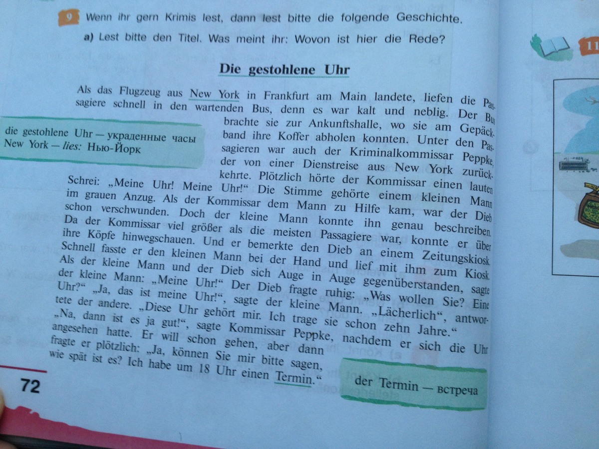 Как только самолёт Нью-Йорк -- Франкфурт-на-Майне приземлился,пассажиры быстро выбежали в ожидающий их автобус,поскольку было холодно и туманно. Автобус привёз их в зал ожидания,где они могли забрать свой багаж. Среди пассажиров был также комиссар полиции Пеппке,который возвращался из командировки в Нью-Йорк.Внезапно комиссар услышал громкий крик:"Мои часы! Мои часы!" Голос принадлежал маленькому мужчине в сером костюме. Как только комиссар подошёл к мужчине,чтобы помочь,вор уже скрылся. Но маленький мужчина мог его точно описать. Поскольку комиссар был выше большинства пассажиров,он мог смотрел поверх их голов. И он заметил вора у газетного киоска. Он быстро схватил маленького человечка за руку и подвёл к киоску.Как только маленький человечек и вор взглянули друг другу в глаза,маленький мужчина сказал:"Мои часы!" Вор спокойно спросил:"Что Вам нужно? Часы?" "Да,это мои часы!",сказал маленький человек."Забавно",ответил другой. "Эти часы принадлежат мне. Я ношу из уже 10 лет." "Ну,это всё конечно хоршо!",сказал комиссар Пеппке,как только рассмотрел часы. Он уже собрался уходить,как внезапно спросил:"Да,скажите пожалуйста,сколько время? В 18 часов у меня встреча."