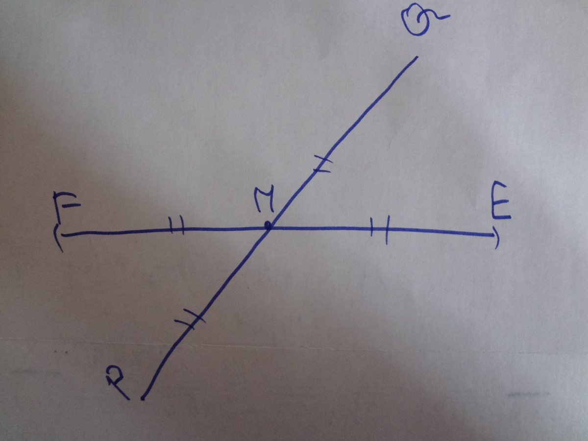 угол PME=FMQ(как вертикальные), по двум сторонам и углу между ними треугольники равны, значит и угол PEM=углу MFE, а они являются вертикальными при параллельных прямых PE и QF и секущей EF, что и требовалось доказать.
