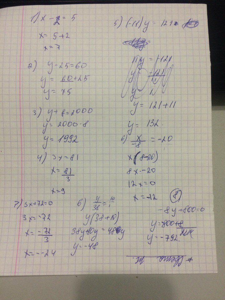 x-2=5;y-25=60;x+70=-100;y+8=2000;3*x=81;(-11)*y=121;x:(-8)=-20;y:38=10;3x+72=0;-8y+800=0