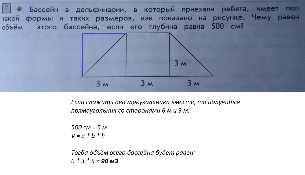 Бассейн в дельфинарии, в который приехали ребята, имеет пол такой формы и таких размеров, как показанно на рисунке. Чему равен объем этого бассейна, если его глубина равна 500 см?