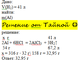 При взаимодействии алюминия с соляной кислотой выделилось 41 л (н.у.) газа. Определите массу растворившегося алюминия.