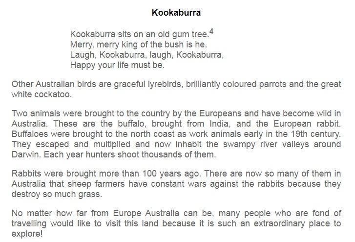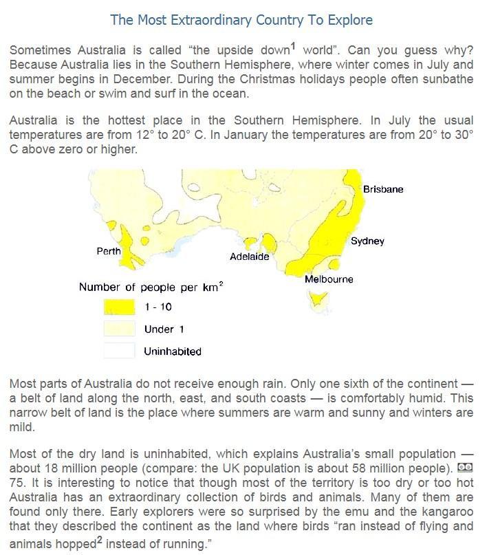 Иногда Австралию называют "страной вверх тормашками". Можете догадаться,почему? Потому что Австралия располагается в южном полушарии,где зима приходит в июле,а лето начинается в декабре. Во время рождественнских праздников люди часто загорают на пляже или плавают и катаются на сёрфе в океане. Австралия -- самое жаркое место южного полушария. В июле обычная температура колеблется от +12 до +20 С°. В январе -- от +20 до +30 С°.Большая часть Австралии не получает достаточно влаги. Только шестая часть континента -- полоска суши вдоль северного,восточного и южного берегов -- достаточно увлажнена. Эта узкая полоска суши -- место с тёплыми солнечными летами и мягкими зимами. Большая часть засушливой земли не заселена,что объясняет маленькое население Австралии -- около 18 миллионов (для сравнения: население Соединённого Королевства составляет около 58 миллионов). Интересно заметить,что хотя на большей части территории слишком засушливо или слишком жарко,в Австралии огромное разнообразие птиц и животных. Многие из них живут только здесь. Первые исследователи были так шокированы,увидев эму или кенгуру,что описывали континент как землю,где птицы "бегают,вместо того,чтобы летать,а звери прыгают,вместо того,чтобы бегать". Австралия -- дом для двух самых притивных в мире млекопитающих -- утконоса и ехидны. Это единственные млекопитающие,откладывающие яйца. Возможно,самое известное животное Австралии -- кенгуру. В Австралии есть 40 разных видов кенгуру,разных расцветок и размеров. Большой рыжий кенгуру и серый кенгуру могут быть ростом с высокого мужчину. Некоторые кенгуру размером с большую собаку. Самый маленький кенгуру -- крысиный. Другое хорошо известное австралийское животное -- коала,напоминающая плюшевого мишку. Большую часть своей жизни он проводит на эвкалиптовых деревьях и ест только эти листья. Среди других животных Австралии -- динго,дикая собака жёлто-коричневого окраса с пышным хвостом; эму,самая большая птица Австралии и одна из самых больших в мире. Она не может летать,но это хороший бегун. Другая забавная птичка -- кукабара,которую часто называют "смеющимся чудаком". Её смехом оглашаются австралийские леса. Австралийцы любят эту птицу настолько сильно,что даже сочинили песню: "Кукабара сидит на эвкалипте/Он весёлый,весёлый король лесов/Смейся,кукабара,смейся,кукабара/Весёлая,должно быть,жизнь твоя" Другие австралийские птицы -- грациозные лирохвосты,яркие попугаи и величественные белые какаду. Два зверя были завезены в страну европейцами и одичали в Австралии. Это буйвол,завезённый из Индии и дикий кролик. Буйволов завезли в начале 19 века на северный берег как тягловых животных. Они сбежали,размножились и теперь заселяют болотистые речные долины вокруг Дарвина. Каждый год охотоники убивают тысячи их. Кролики были завезены более 100 лет назад. Сейчас в Австралии их настолько много,что овцеводы постоянно воюют с ними,поскольку они уничтожают огромное количество травы. Вне зависимости от того,насколько далека от Европы Австралия,множество увлекающихся путешествиями людей хотело бы посетить эту страну,поскольку она -- самая необычная для исследований.