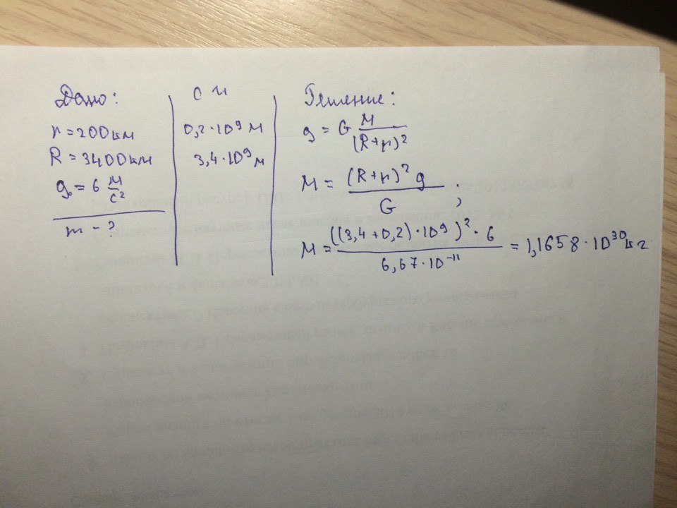2. Астронавты при облете некоторой планеты на высоте 200 км обнаружели, что ускорение свободного падения равно 6 м/с^2. радиус планеты 3400 км. Какова масса планеты?