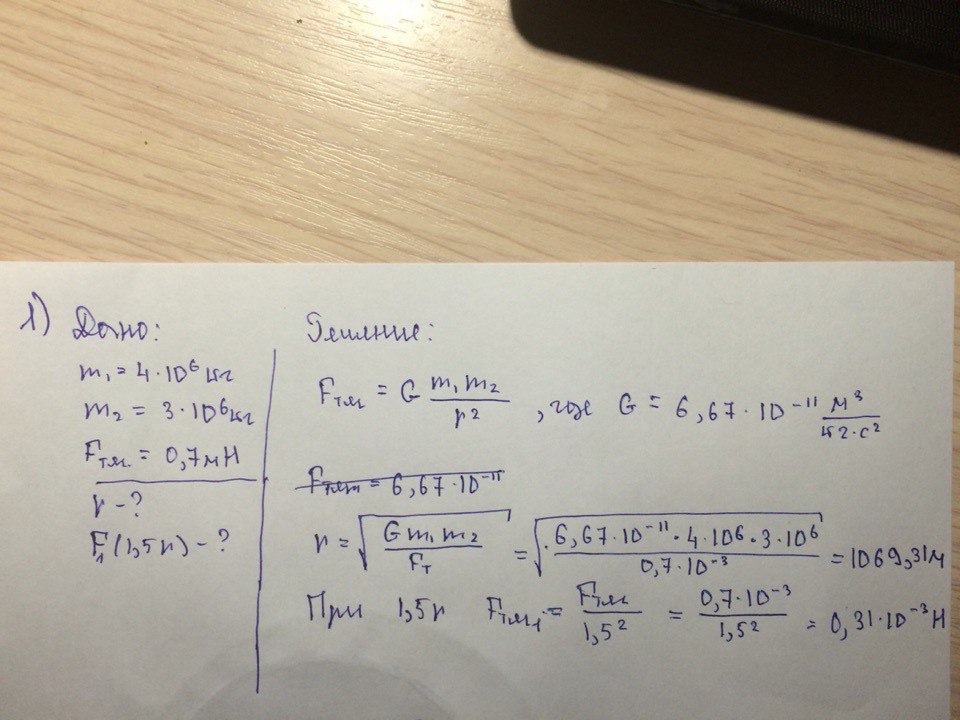 1. Два тела массами 4 *10^6 кг и 3*10^6 кг притягиваются с силой 0,7 мН. На каком расстоянии они находятся? Как изменится сила притяжения при увеличении расстояния в 1,5 раза?