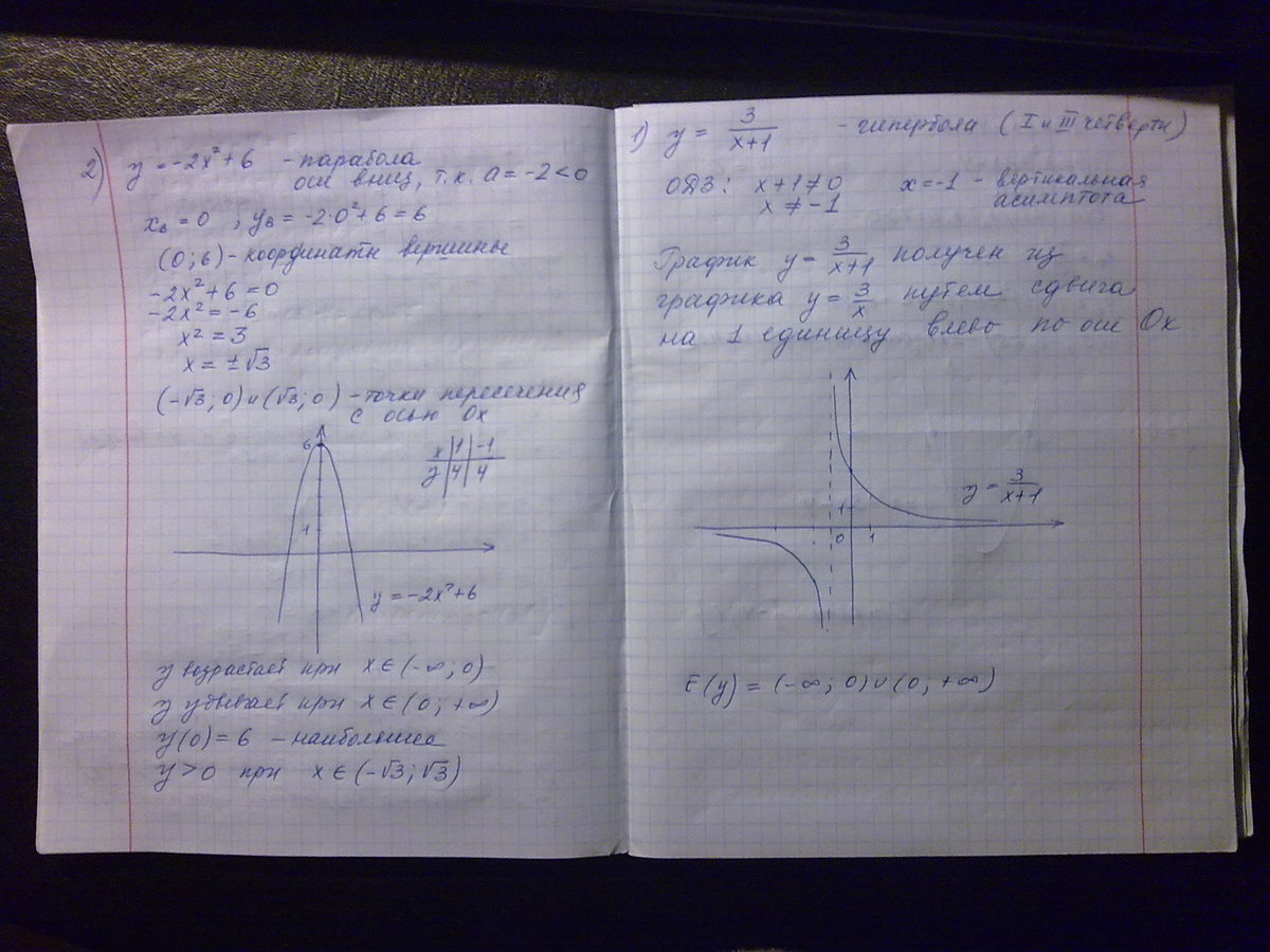 1.Постройте график функции у=3х+1.Укажите множество значений функции. 2.Постройте график функции у= -2х во второй степени +6=0.с помощью графика найдите: а)промежутки возрастания и убывания б)наибольшее значение функции в)при каких значениях х у больше 0 3.решите графически уравнение х во второй+3х -4=0 Ребята помогите пожалуйста в графиках вообще нечего не понимаю.((.помогите пожалуйста желательно сфотографированым графиком!
