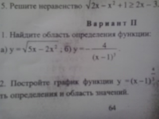Так как корень четной степени существует из неотрицательного числа на множестве вещественных чисел, то областью определения заданной функции являются все значения независимой переменной x, удовлетворяющие условию: 5x - 2x²≥0.