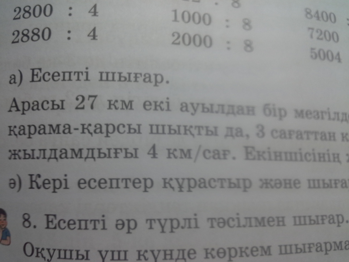 есепты шыгар арасы 27 км екы ауылдан быр мезгылде екы жаяу адам быр-бырыне каоаиа карсы шыктыдп3 сагаттан кейын кездесты бырыншысынын жылдамдышы4 км /саг.Екыншысынын жылдамдыгы кандай?
