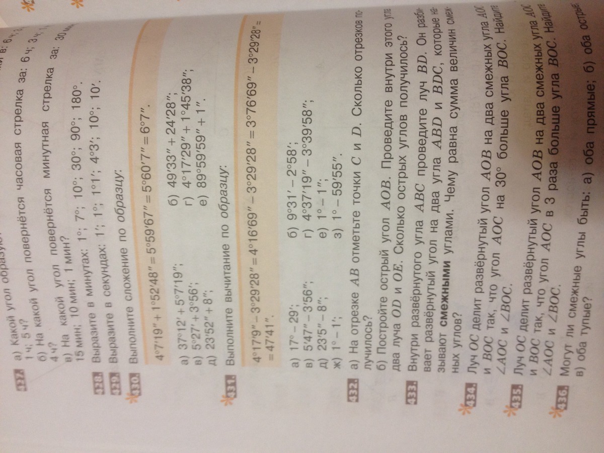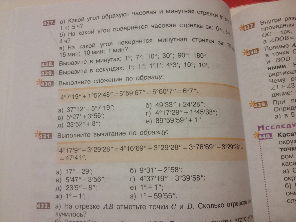 а)37°12'+5°7'19"=42°19'19"; б)49'33"+24'28"=73'61"=1°14'1"; в)5°29'+3°59'=9°28'; г)4°17'29"+1°45'38"=5°62'67"=6°3'7";д)23'52"+8"=24'; е)89°59'59"+1"=90°. Задания подобного рода решаются как задачи на сложение единиц времени. Самая большая единица здесь - это градус(°), он равняется 60 минутам (') и 3600 секундам ("). В задачах на время это час. То есть, сначала ты складываешь градусы с градусами, минуты с минутами и секунды с секундами. Затем смотришь: если число минут превышает 60, то ты вычитаешь из их числа 60 и прибавляешь к градусам 1.(Например: получилось 5° 75', преобразовываешь в 6°15'). Аналогично поступаешь с секундами, только единица прибавляется к числу минут. И всё :) Надеюсь, понятно)