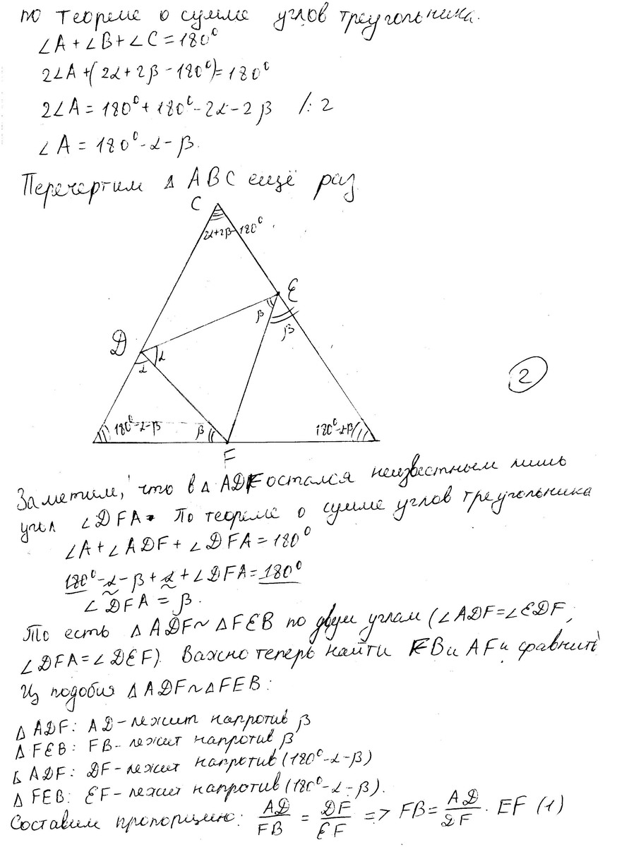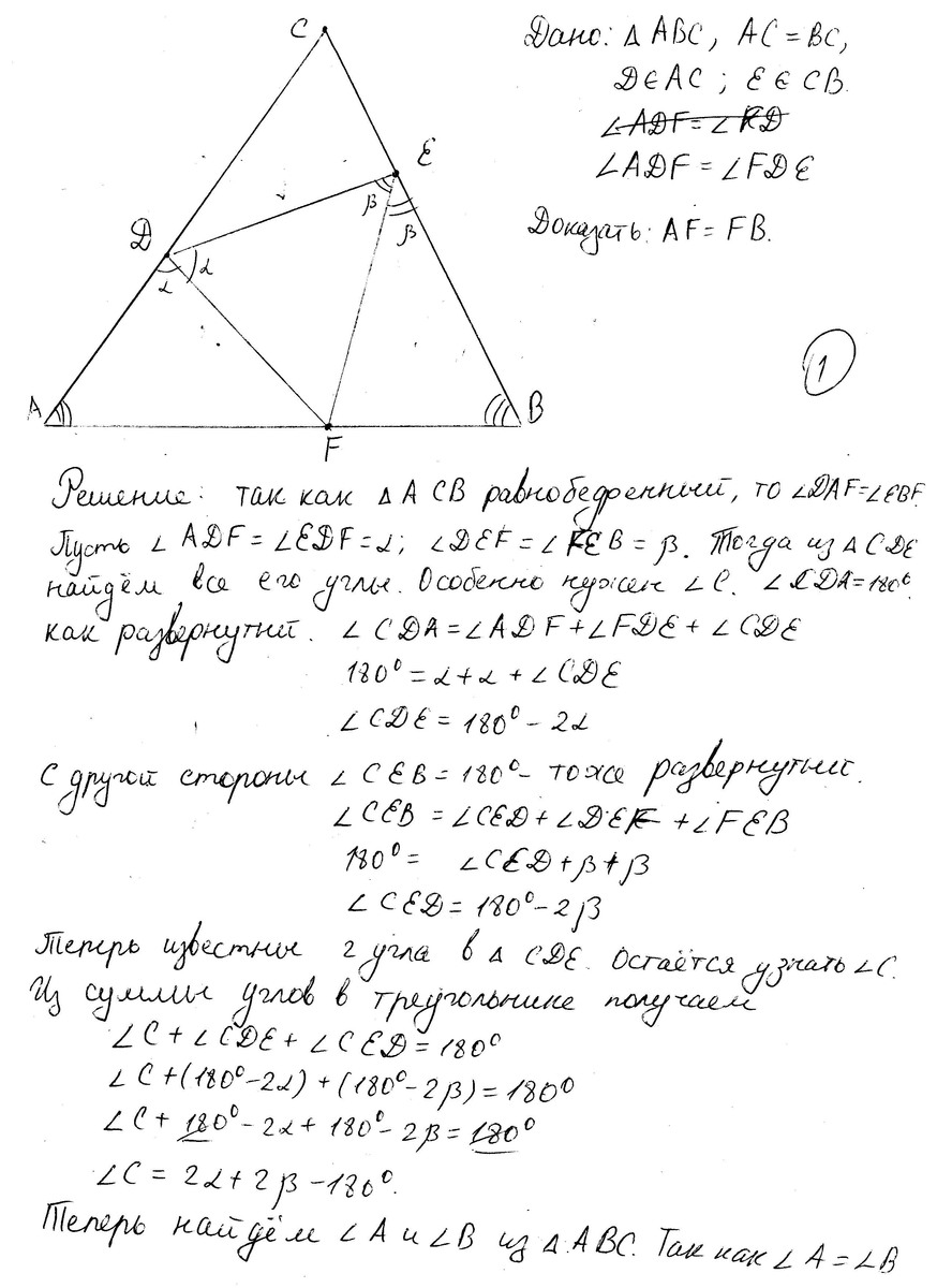 соответственно. Точка F пересечения биссектрис углов DEB и ADE лежит на основании AB.