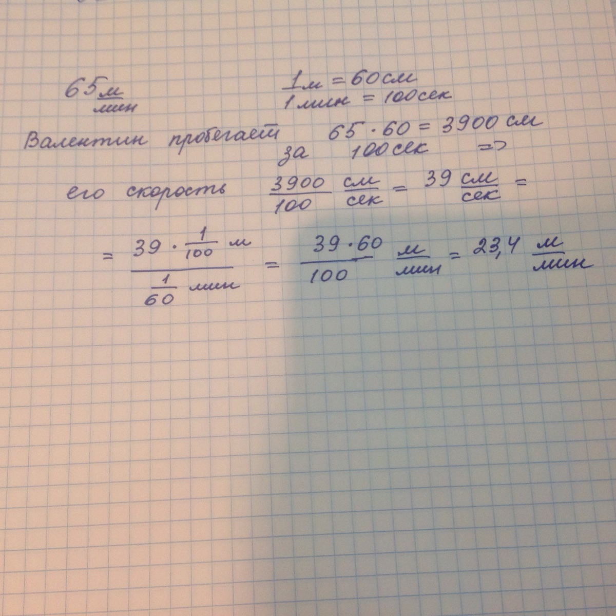 таракан Валентин объявил,что умеет бегать со скоростью 65м/мин.Ему не поверили,и правильно:на самом деле Валентин все перепутал и думал,что в метре 60 сантиметров,а в минуте 100 секунд.Растояние Валентин измерял в сантиметрах,причем сделал это правильно,а время-в секундах,и тоже при этом не ошибся.С какой скоростью(в "нормальных" м/мин)бегает таракан Валентин?