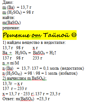 Вычислить массу соли ,которая появляется в результате растворения бария массой 13,7 у сульфатной кислоте массой 98г РЕШИТЬ ЗАДАЧЕЙ
