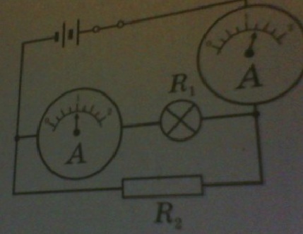 Сопротивление лампы R(1) равно 10 Ом.Найдите сопротивление проводника R(2).Какую силу тока покажет амперметр А?(I1=1 А,,,I2=1.3 А)