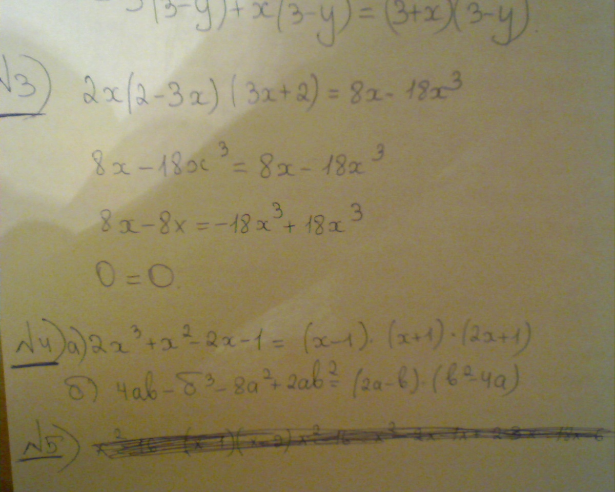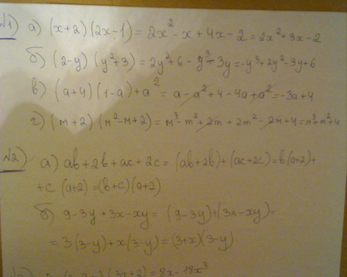 ПОМОГИТЕ ПОЖАЛУЙТСА КТО НИБУДЬ! НЕ ВСЕ,НО ХОТЯ БЫ ЧТО ТО- Всем привет! Прошу помочь решить конрольную работу по алгебре 7 класс. 1)Упростите выражения а)(х+2)(2х-1)= б) ( 2-у)(у в квардрате+3) в)(а+4)(1-а)+а в квадрате г)(м+2)(м в квадрате - м +2) 2)Разложить на множители: а) аб+2б+ас+2с б)9-3у+3х-ху 3) Докажите тождество: 2х(2-3х)(3х+2)=8х-18х в кубе 4) Представьте в виде произведения: а) 2х в кубе + х в квадрате-2х-1 б) 4 аб - б в кубе - 8а в квадрате+2 аб в квадрате 5) ЗАДАЧА: Квадрат задуманного числа на 16 больше,чем произведение двух чисел,меньших задуманнного на 1 и на 2 соответственно.Найдите задуманнное число. СПАСИБО КТО ПОМОЖЕТ!