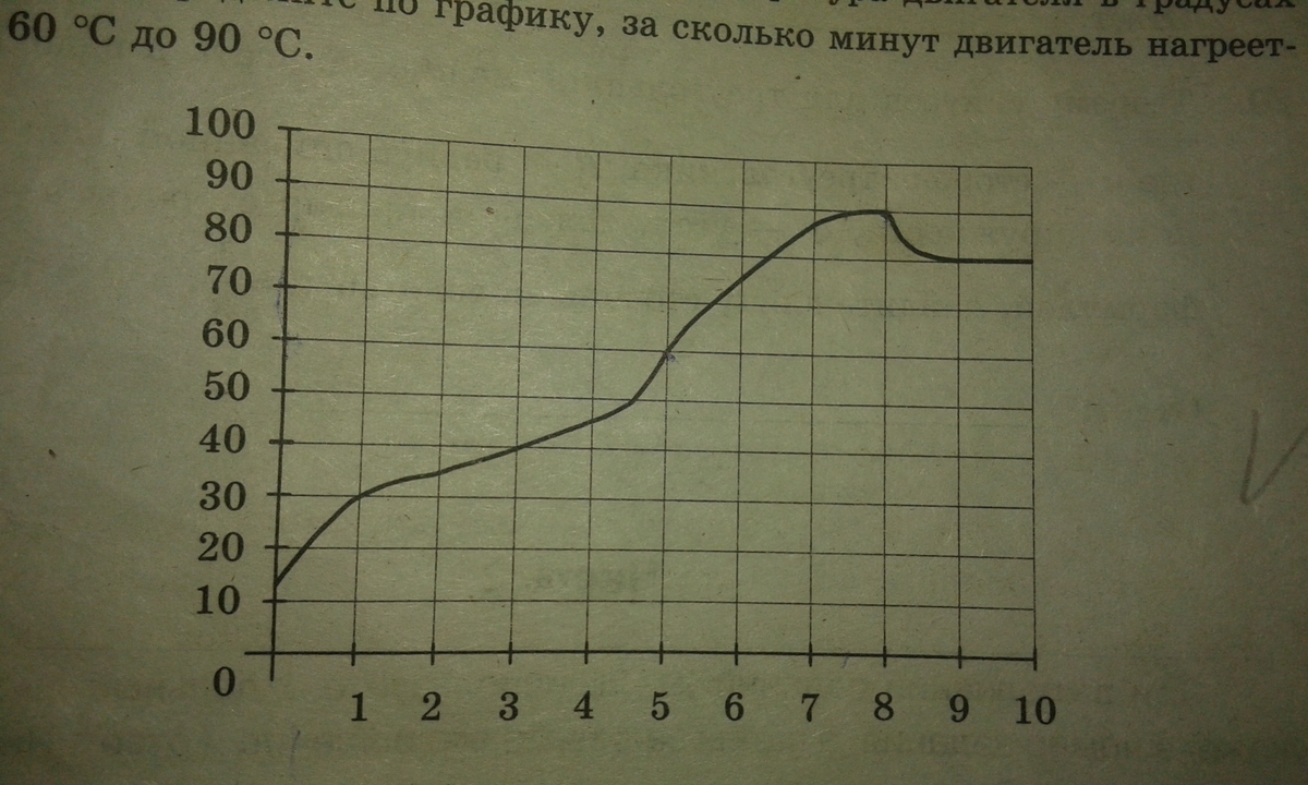 На графике показан процесс разогрева двигателя легкового автомобиля. На оси абсцисс откладывается время в минутах, прошедшее от запуска двигателя, на оси ординат — температура двигателя в градусах Цельсия. Определите по графику, сколько минут двигатель нагреется с 60°с до 90°с.