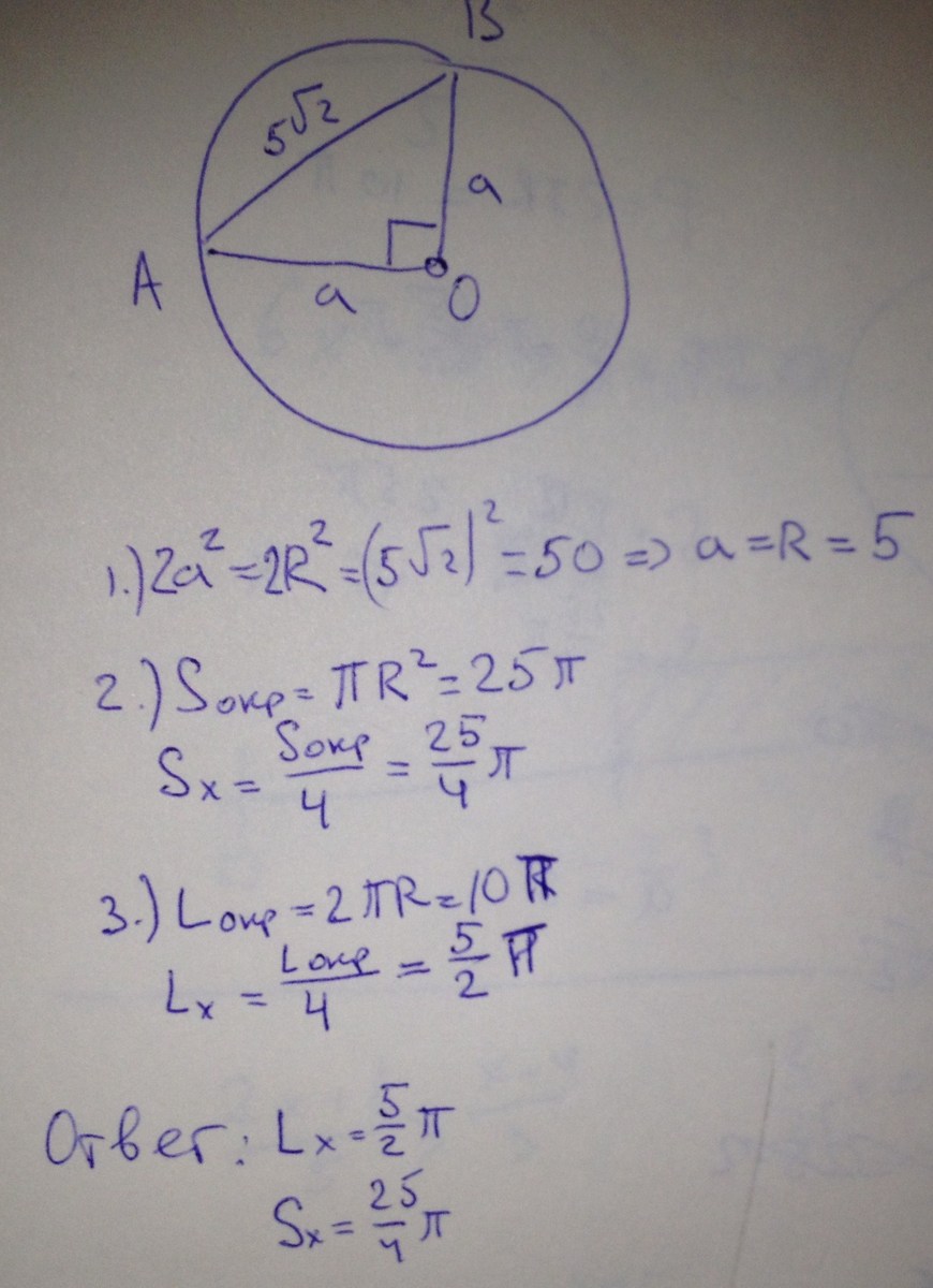 хорда окружности равна 5 корней из 2 и стягивает дугу 90 гррадусов.найдите длинну дуги и площадь соответсвующего сектора