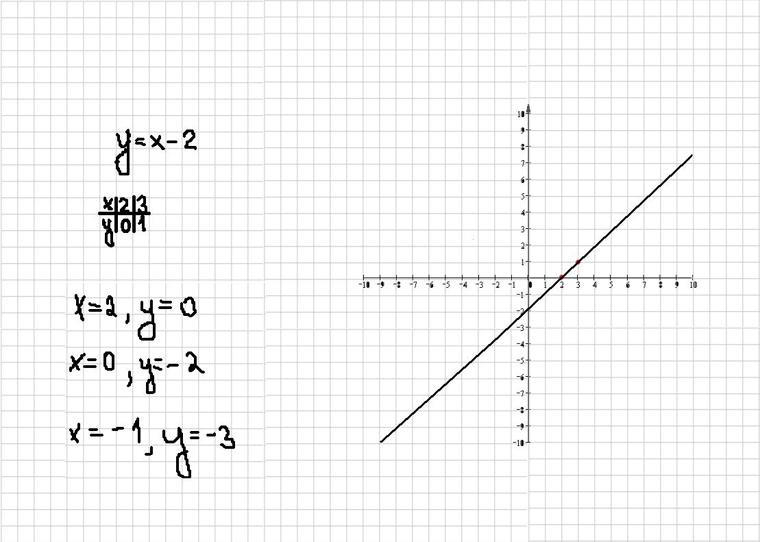 1.Постройте график линейной функции y=x-2 2.Найдите по графику линейной функции y=x-2 а) те значения y, при которых x=2,x=0,x=-1 б)те значения x, при которых y=4, y=7,y=-5 3. При каком значении k график функции y=kx проходитчерез точку A(3;6)?