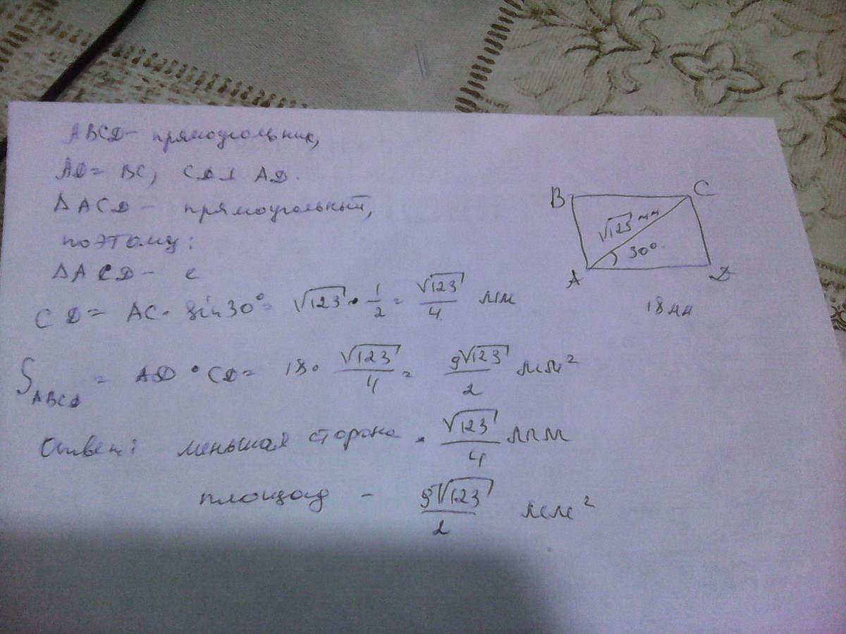 Вычисли меньшую сторону и площадь прямоугольника, если его большая сторона равна 18 мм, диагональ равна 123√ мм и образует с большей стороной угол 30 градусов.