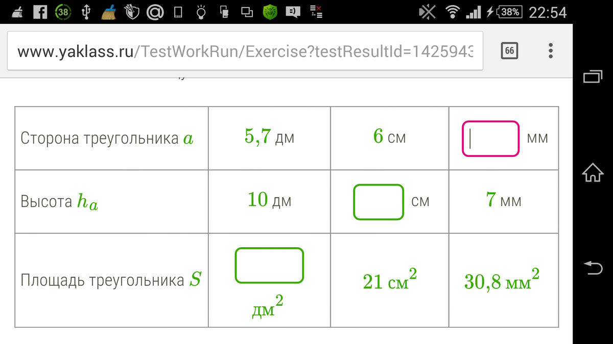 28,5 дм^2; 7 см; 4,4 мм