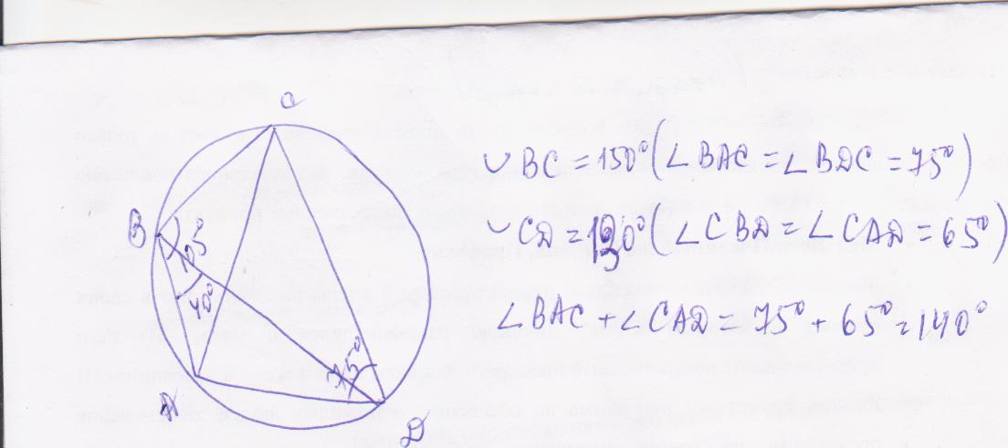 Четырехугольник ABCD вписан в окружность. Угол ABC равен 105 градусов, угол ABD равен 40 градусов. Найдите угол BAC.