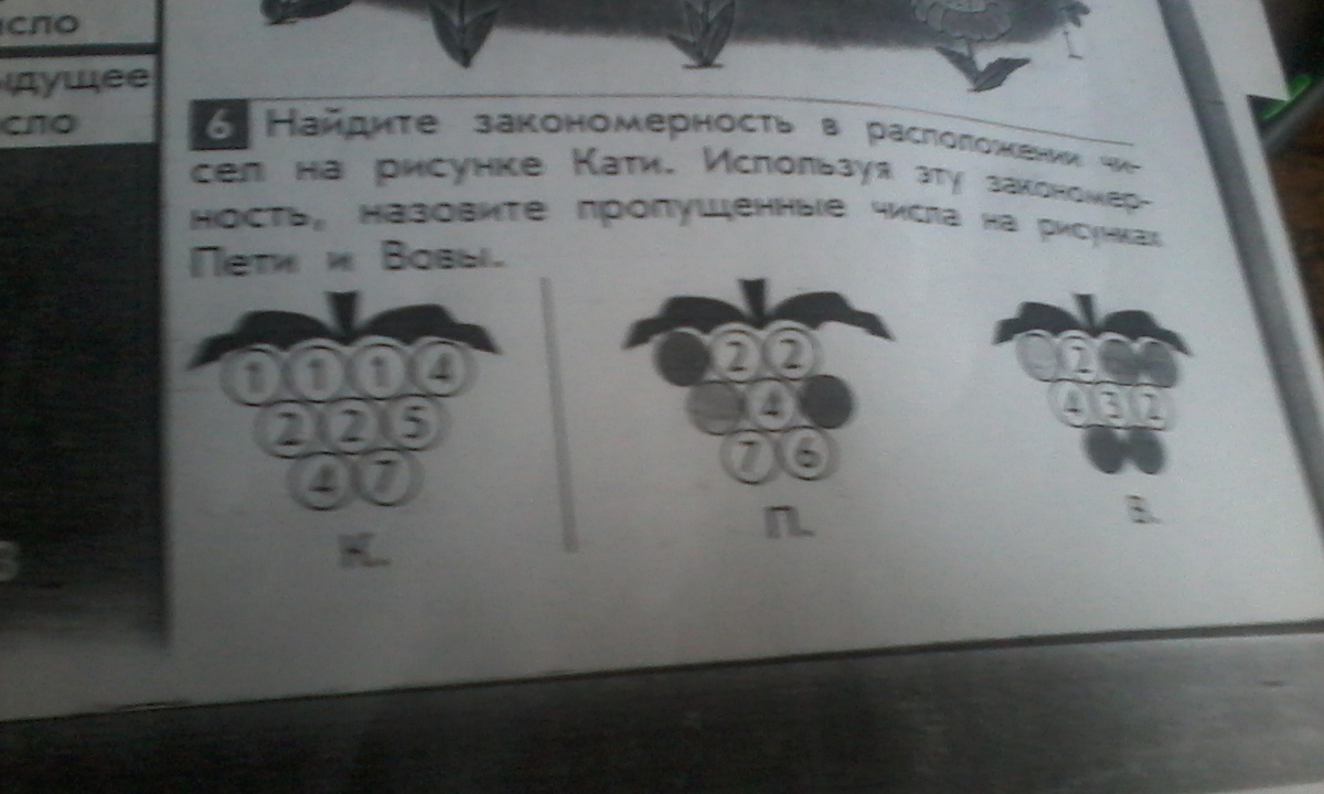 Найдите закономерность в расположении чисел на рисунке Кати.Используя эту закономерность,назовите пропущенные числа на рисунках Пети и Вовы.