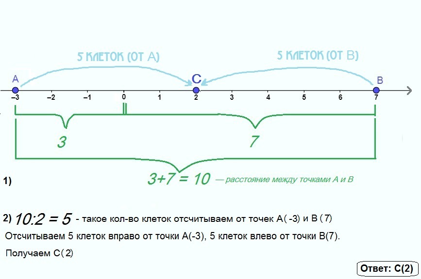 2) Найдём, какое количество клеток нужно отсчитать от каждой из точек A(-3), B(7), чтобы точка C была равноудалена от каждой из них: