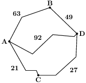Из пункта A в пункт D ведут три дороги. Одновременно из пункта A в пункт D выехали грузовик, автобус и легковой автомобиль. Грузовик едет через пункт B со средней скоростью 64 км/ч, автобус едет через пункт C со средней скоростью 48км/ч. По третьей дороге — без промежуточных пунктов — едет легковой автомобиль со средней скоростью 46 км/ч. На рисунке показана схема дорог и расстояние (в км) между пунктами по дорогам. Какое транспортное средство доберётся до D позже других? В ответе укажите, сколько часов оно будет находиться в пути.
