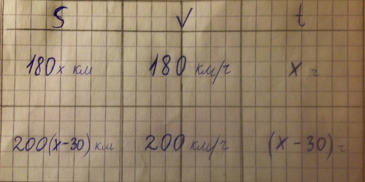 Составим таблицу, где указаны все данные: (фото). За х примем время полёта при средней скорости 180 км/ч. Поскольку оба раза он преодолел одинаковое расстояние, то верно равенство 180х=200(х-30). Теперь остаётся найти х: 180х=200(х-30); 180х=200х-6000; 200х-180х=6000; 20х=6000; х=6000:20; х=300. Чтобы узнать расстояние, умножаем найденное время на скорость: 300*180=54 000 км. Ответ: 54 000 км.