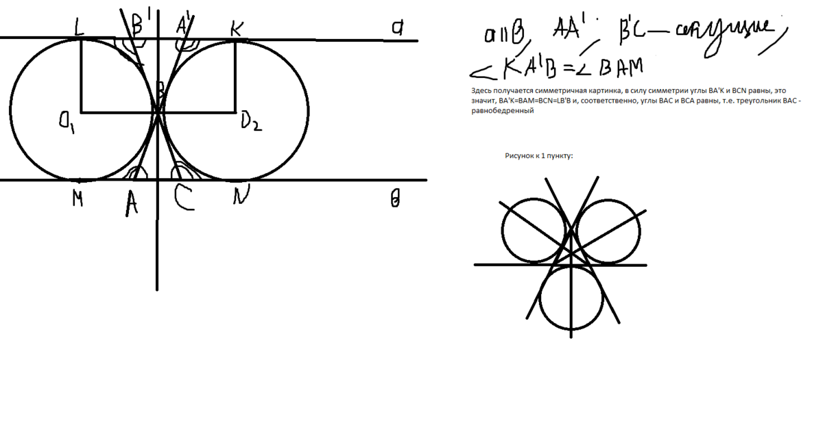 С пунктом 1 чуть потруднее. В рисунке есть обозначения, которые помогут разобраться. В чём суть: есть прямая, которой касаются две окружности равных радиусов (с одной стороны). Значит, существует прямая, параллельная данной, которой так же с одной стороны будут касаться обе заданные окружности (она, кстати, находится на расстоянии 2R от первой прямой). Используя секущие при параллельных прямых, рассматриваем равные углы и смежные с ними, в итоге приходим к тому, что 2 угла у треугольника ABC равны, и, следовательно, он равнобедренный.