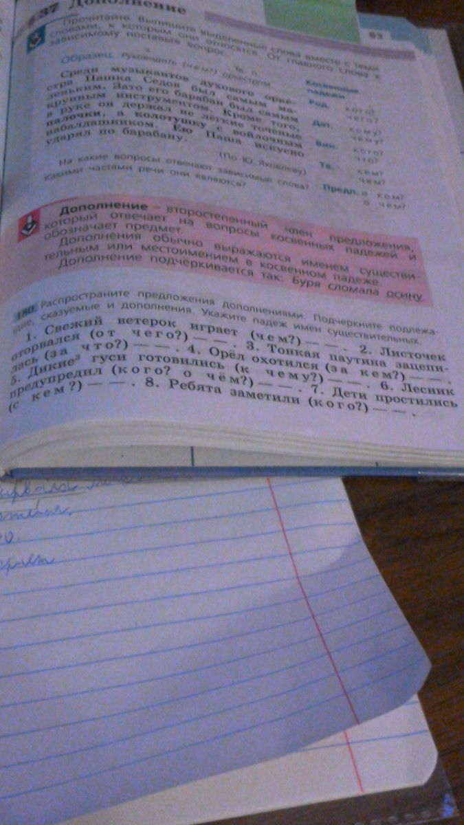 1. Свежий ветерок (Им.пад.) играет (чем?) листьями (ветерок — подлежащее, играет — сказуемое, листьями — дополнение; листьями — Тв.пад.). 2. Листочек (Им.пад.) оторвался (от чего?) от ветки (листочек — подл., оторвался — сказ., от ветки — доп; ветки — Род.пад..). 3. Тонкая паутина (Им.пад.) зацепилась (за что?) за ветку (паутина — подл., зацепилась — сказ., за ветку — доп.; ветку — Вин.пад.). 4. Орёл (Им.пад.) охотился (за кем?) за кроликом (орёл — подл., охотился — сказ., за кроликом — доп.; кроликом — Тв.пад.). 5. Дикие гуси (Им.пад.) готовились (к чему?) к перелёту (гуси — подл., готовились — сказ., к перелёту — доп.; перелёту — Дат.пад.). 6. Лесник (Им.пад.) предупредил (кого? о чём?) путника об опасности (лесник — подл., предупредил — сказ., путника, об опасности — доп.; путника — Вин.пад., опасности — Предл.пад.). 7. Дети (Им.пад.) простились (с кем?) с родителями (дети — подл., простились — сказ., с родителями — доп; родителями — Тв.пад..). Ребята (Им.пад.) заметили (кого?) учителя (ребята — подл, заметили — сказ., учителя — доп.; учителя — Вин.пад.).