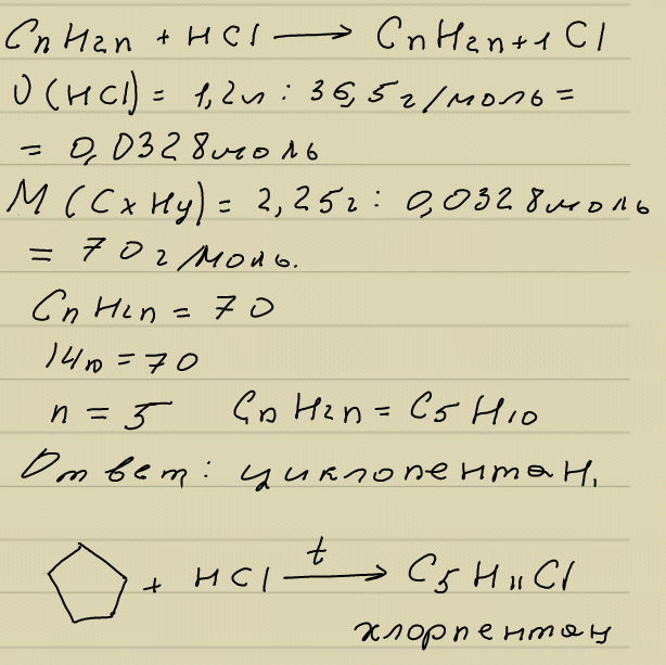 Установите молекулярную формулу цикла алкана, если известно что 2,25 его способны присоединить 1,2 л. хлороводорода.
