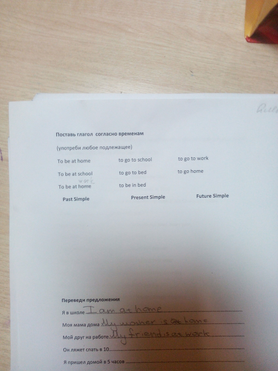 Present Simple: We go to school. He goes to bed. She is in bed.