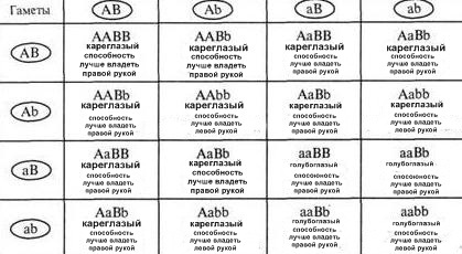 У человека карие глаза доминируют над голубыми, а способность лучше владеть правой рукой- над левой. Какие новые сочетания признаков могут появиться у потомства в результате брака родителей, гетерозиготных по обоим признакам? Известно, что аллельные гены этих признаков находятся в разных парах хромосом.