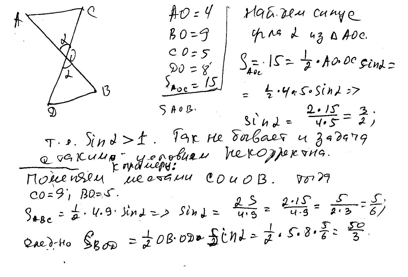 Дано: AO=4,BO=9,CO=5,DO=8. площадь AOC = 15.